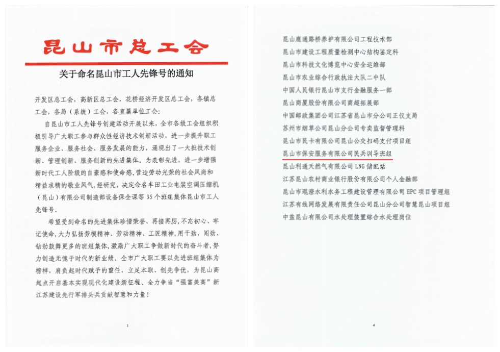近日,昆山市總工會表彰了一批“工人先鋒號”班組集體,其中昆山市保安服務(wù)有限公司民兵訓(xùn)導(dǎo)班組被授予昆山市“工人先鋒號”榮譽稱號。