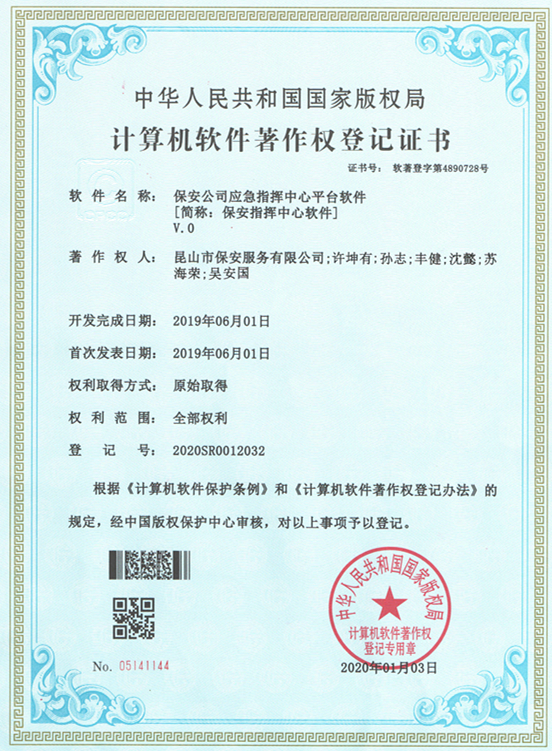 近日,根據(jù)《計(jì)算機(jī)軟件保護(hù)條例》和《計(jì)算機(jī)軟件著作權(quán)登記辦法》規(guī)定,經(jīng)中國版權(quán)保護(hù)中心審核,保安公司應(yīng)急指揮中心平臺(tái)軟件被正式授予《中華人民共和國國家版權(quán)局計(jì)算機(jī)軟件著作權(quán)登記證書》,證書號(hào)為:軟著登記字第4890728號(hào)。