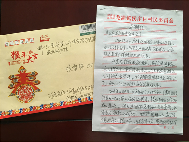 樂(lè)于助人 暖人心。2月9日,保安公司收到一封來(lái)自河南省新鄭市的表?yè)P(yáng)信。據(jù)了解,原來(lái)是一名河南省的陳姓先生被其朋友騙到昆山,被非法傳銷所控制,陳先生趁傳銷人員不備,逃離至距離最近公交派出所,公司駐公交所的值班保安員張雪林同志第一時(shí)間將此事上報(bào)至公交所民警處,并親自為陳先生買了回河南新鄭市的車票。
