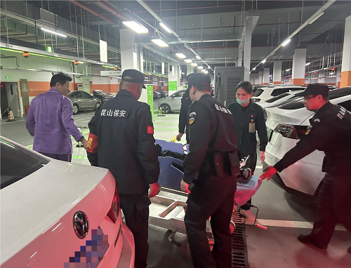 2024年12月6日中午12點(diǎn)左右,保安公司駐中醫(yī)醫(yī)院保安員朱劍剛在地下停車場進(jìn)行日常巡邏,在巡邏至250號車位時(shí),朱劍剛發(fā)現(xiàn)一名病人暈倒在汽車?yán)锴闆r危急,立即使用對講機(jī)呼叫急診部門,請求派遣拖床和護(hù)士前來處置。急診部門迅速響應(yīng),派遣急診保安推著拖床前往現(xiàn)場,同時(shí),附近的四名巡邏隊(duì)員迅速趕到250號車位一起協(xié)助急診隊(duì)員進(jìn)行救援。
