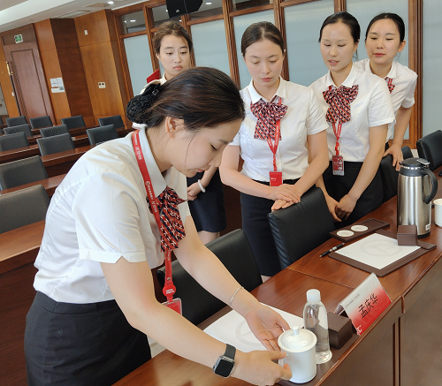 為進(jìn)一步規(guī)范農(nóng)商行項(xiàng)目會(huì)議服務(wù)標(biāo)準(zhǔn)化,提升會(huì)務(wù)人員隊(duì)伍整體形象和服務(wù)水平,7月14日,昆通物業(yè)駐農(nóng)商行項(xiàng)目物管處組織全體會(huì)務(wù)工作人員開展會(huì)議服務(wù)工作培訓(xùn)。