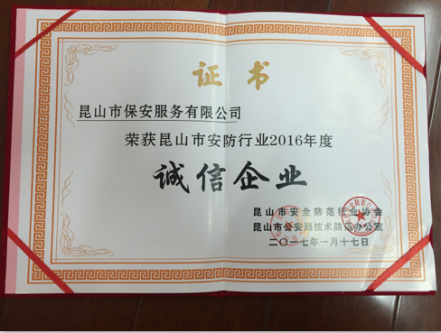保安公司榮獲2016年度昆山市安防行業(yè)“誠(chéng)信企業(yè)”